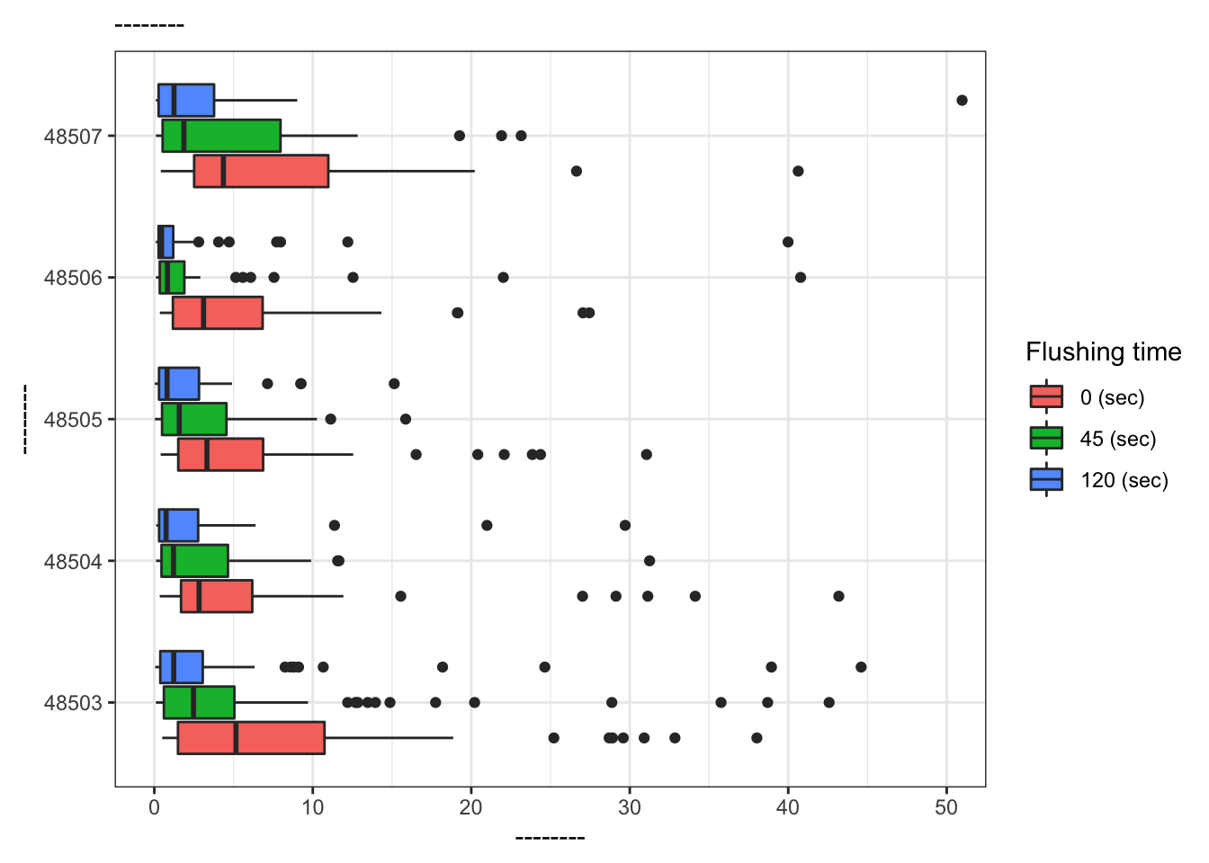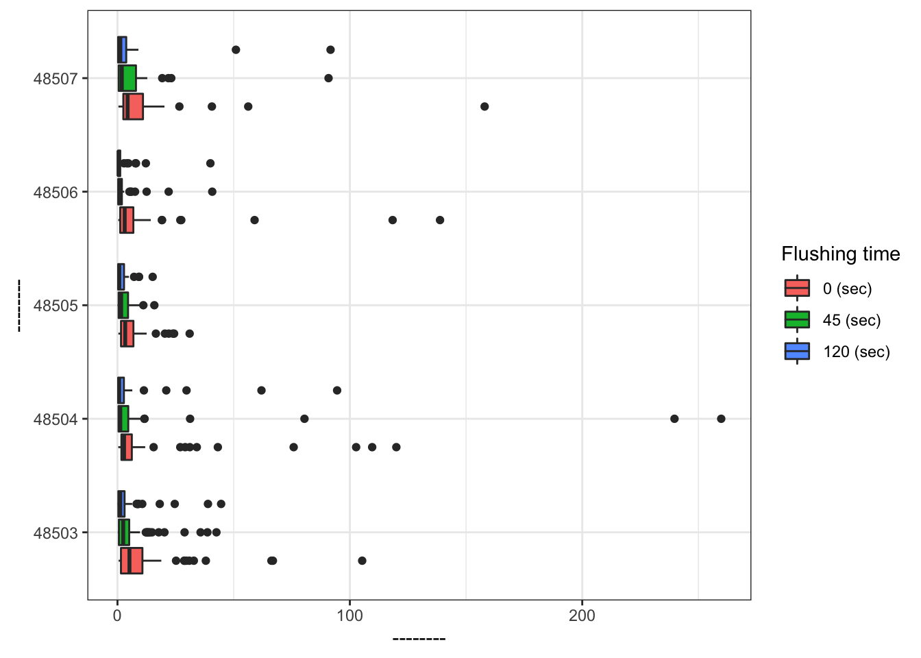 filter(zip %in% 48503:48507, lead < 1000)Below are side-by-side box plots for the three flushing times in each of the five zip codes we considered. Add x and y labels; add a title by inserting title = "title_name" inside the labs() function.