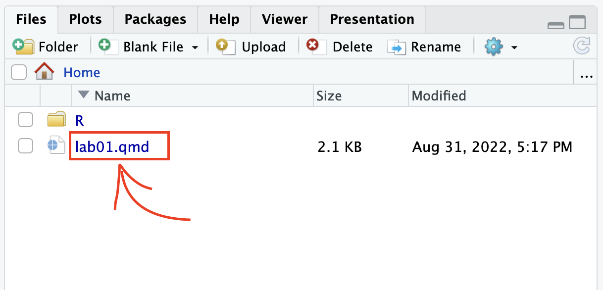 2. Under the “Files” tab on the right hand side, click on lab01.qmd to open the lab template.